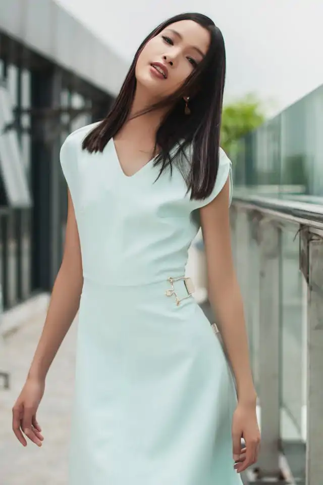 - 1 sleeveless midi dress in a professional “A-line” or column cut.